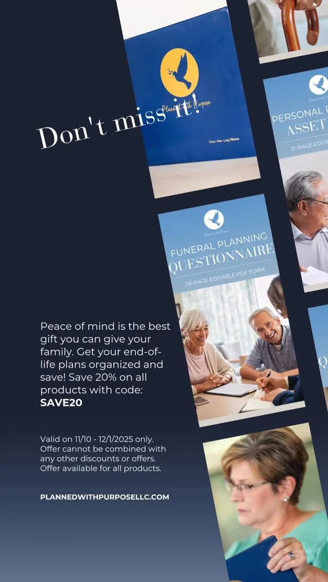 The mission of Planned with Purpose, LLC is to help families prepare with confidence and compassion by providing tools that keep every detail organized — so your loved ones are supported, informed, and at ease when it matters most. Planned with Purpose, LLC offers a variety of products that will provide you with peace of mind through end-of-life planning, including a custom planning binder, a comprehensive funeral questionnaire, key asset forms, and a family history questionnaire to organize everything needed to complete your or your loved one’s end-of-life plans.